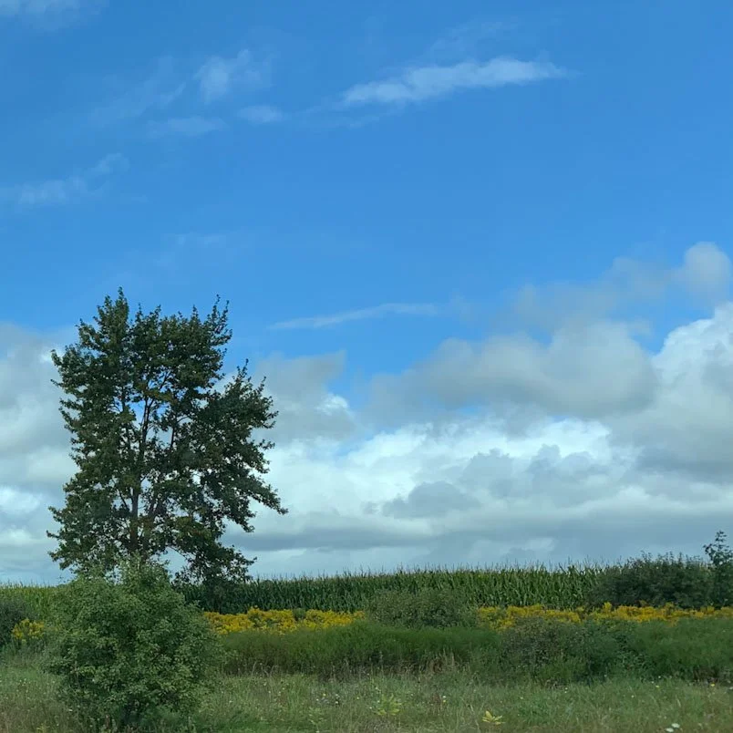 White and grey clouds over a green corn field with a green tree. J.Scott, 2024